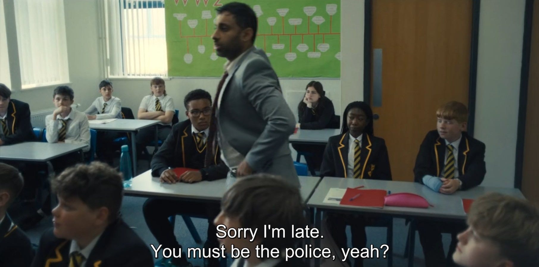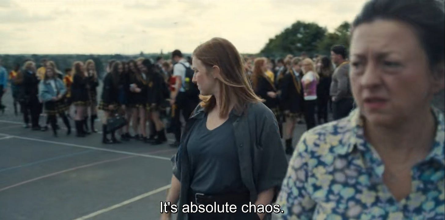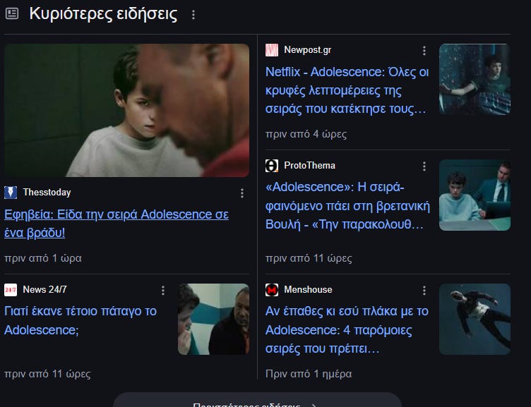 Ανάμεσα σε παλιά βοηθήματα, στοίβες αδιόρθωτα γραπτά, φωτοτυπίες, σβηστές οθόνες υπολογιστών που ξέμειναν από την προηγούμενη γύρα ανανέωσης του εξοπλισμού αλλά και το ημι-υποχρεωτικό πόστερ με Σολωμό και σχετική ατάκα, μία συνάδελφος με ρώτησε αν έχω δει μια σειρά. Μου έκανε εντύπωση καθώς σπανίως μιλάμε για κάτι πέρα από τα καθημερινά του σχολείου. Η σειρά ήταν το Adolescence.
