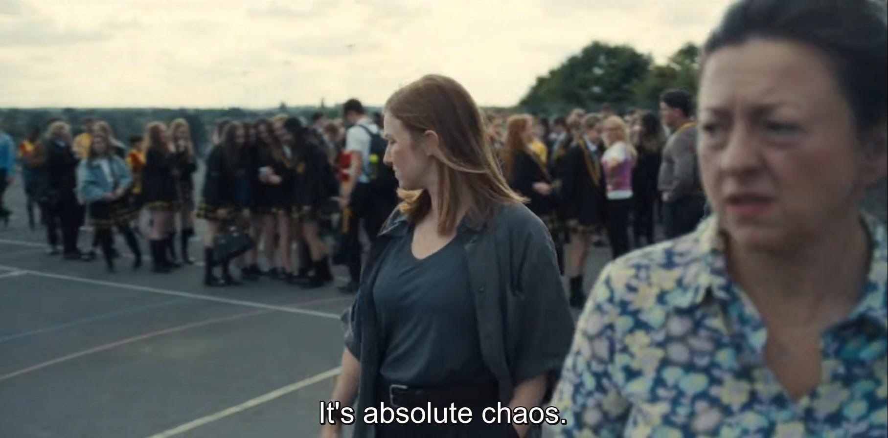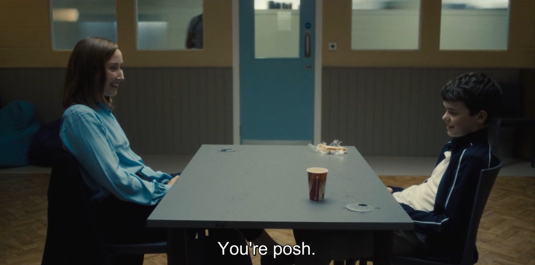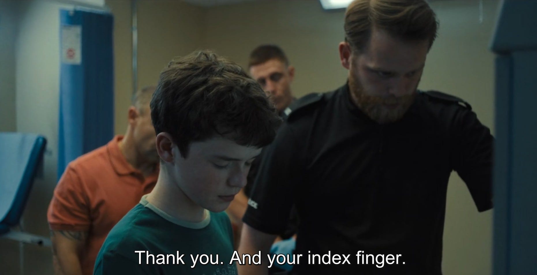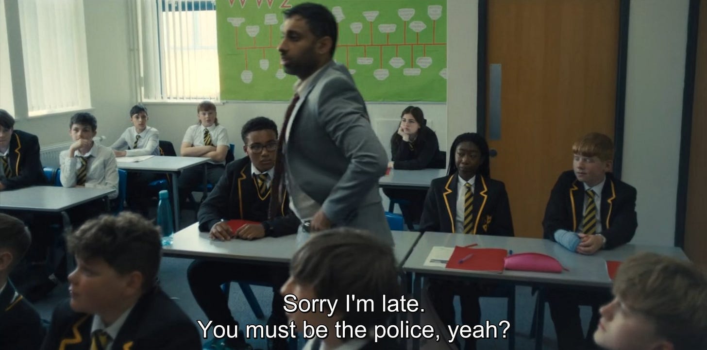 Η σειρά όμως δεν είναι κείμενο αλλά κινούμενη εικόνα. Πολλά - αν όχι τα περισσότερα - από τα παραπάνω θα μπορούσαν να ειπωθούν και σαν σχολιασμός κειμένων για παιδιά που βρίσκουμε στον τύπο, σε ατάκες από γραφεία καθηγητών κ.ο.κ.. Ειδικά σαν κινούμενη εικόνα όμως, η σειρά σχολιάστηκε κατά κόρον για την κάμερά της και τον ρεαλισμό της. Πέρα από το τεχνικό κομμάτι και τη σχετική δεξιοτεχνία που απαιτείται για την εξίσωση ένα πλάνο ανά επεισόδιο, η κάμερα σαν βλέμμα του αφηγητή είναι, μου φαίνεται, ένας τρόπος να σχετίζεσαι με αυτό που δείχνεις: το πως μετακινείται, που στοχεύει, που περνάει γρήγορα και που κοντοστέκεται είναι όλα μέρος της γραμματικής μιας σχέσης. Η κάμερα του Adolescence είναι ψυχρή: ακολουθεί τα υποκείμενά της από κοντά, κινείται με απόλυτη ηρεμία, όταν παίζει σωματοποιημένη έκφραση του συναισθήματος κολλάει στις μούρες τους, όταν αλληλεπιδρούν κινείται σχετικά αργά από το ένα στο άλλο, σαν κάποιου είδους εξωγήινο μάτι που παρατηρεί διάφορα αξιοπερίεργα που συμβαίνουν με ενδιαφέρον εντομολόγου. Η ψυχράδα της αυτή είναι χαρακτηριστική του ψευδορεαλισμού της. Στην πιο συγκινητική σκηνή στιγμή της σειράς, στο διάλογο των δύο γονιών, η κάμερα στέκεται δίπλα απ’ το ζευγάρι, και κινείται νωχελικά από το ένα πρόσωπο στο άλλο, δίνει την αίσθηση μίας παράθεσης αντιδράσεων και όχι της ζωντανής σχέσης, μία δεξια μία αριστερά, πόνος μαμάς, πόνος μπαμπά, δύο πέτρες η μία δίπλα στην άλλη. Το ίδιο και στο σχολείο που με το ίδιο νωχελικό μάτι παρατηρούμε μία τεράστια γκάμα περιστατικών, άσκηση για φωτιά, ματαιωμένες εκπαιδευτικούς, συζητήσεις με μεμονωμένους μαθητές, ενημερώσεις σε τάξεις, ντροπαλούς εφήβους, μία κλωτσοπατινάδα στο προαύλιο, βάλε το κινητό σου μέσα, αργοπορημένους καθηγητές.