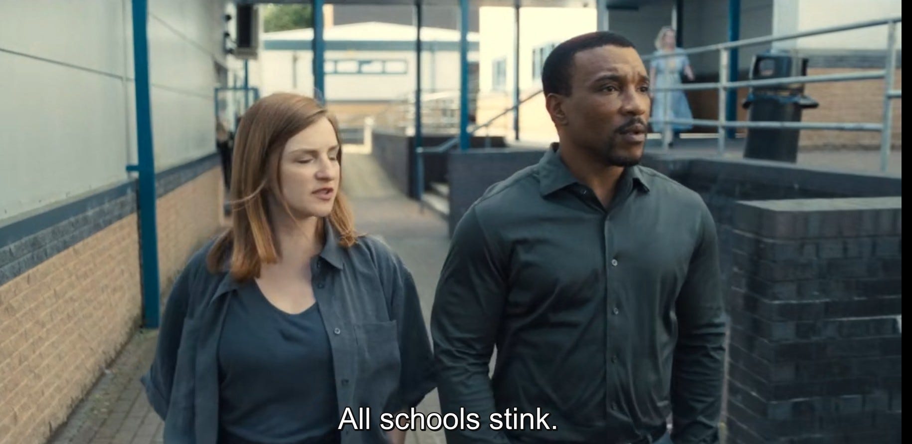 (αστυνόμος Μπέκαμ) Do you know what? I honestly...I just can't stand this fucking place. (...) Does it look like anyone's learning anything in there to you? Hmm? It just looks like a fucking holding pen. Videos in every class. Mr. Malik just walking in and out when he wants. And you said it fucking smells. (συναδέλφισσα Μπέκαμ που συγκατανεύει) It does fucking stink. All schools stink.